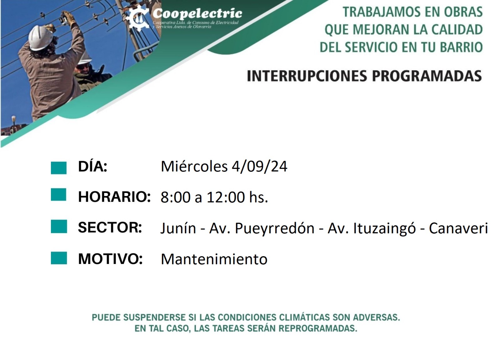 Interrupción de energía eléctrica por mantenimiento